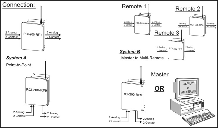 The RCI-200-RF9 may also be used as a remote in a multi-remote system where 2, 4 or 8 remote units at different sites may communicate with one central master. The RCI-800-RF9 may be used to serve as the master.