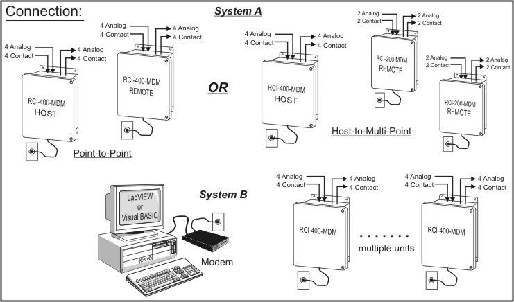 The RCI-400-MDM is a bi-directional remote communication system that exchanges the status of 4 dry contact inputs and 4 analog inputs between a master and remote unit or a PC equipped with a modem. A basic system consists of