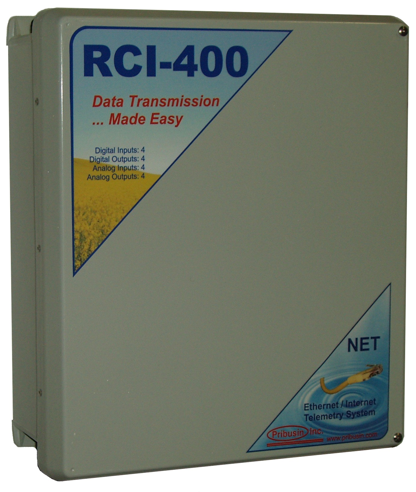 The RCI-400-NET is a bi-directional remote communication system that exchanges the status of 4 dry contact inputs and 4 analog inputs between a master and remote unit. A basic system consists of one master station and one remote station each with 4 dry contact and 4 analog inputs and 4 'C' relay contact and analog outputs.