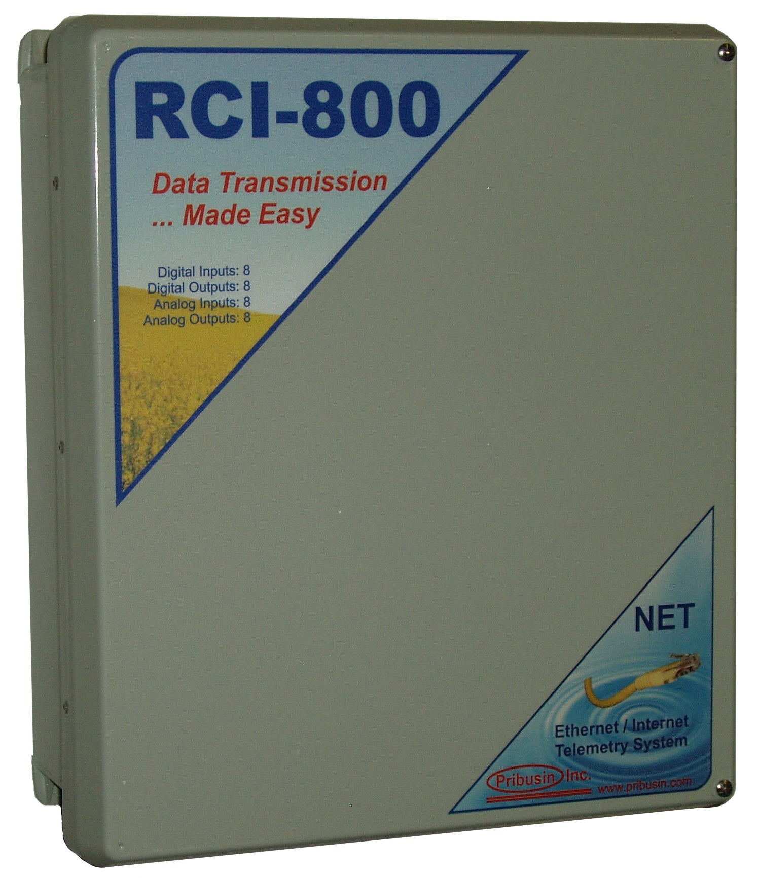 The RCI-800-NET is a bi-directional remote communication system that exchanges the status of 8 dry contact inputs and 8 analog inputs between a master and remote unit. A basic system consists of one master station and one remote station each with 8 dry contact and 8 analog inputs and 8 'C' relay contact and analog outputs.