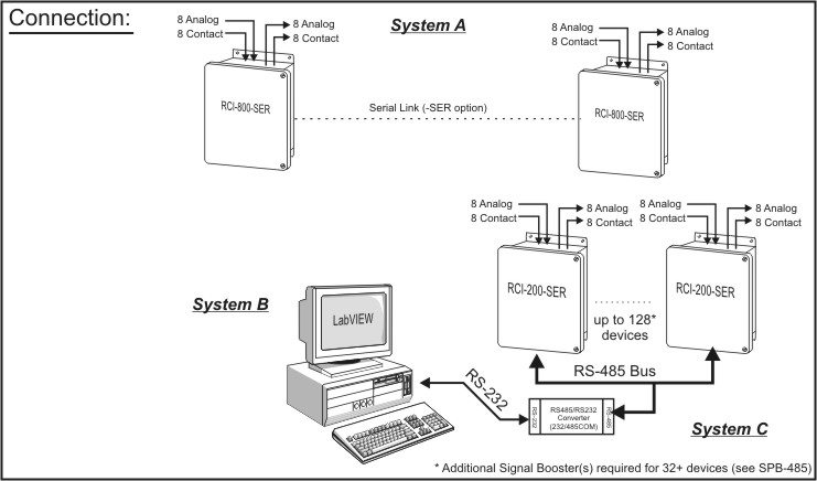 | Function: The RCI-800-SER is a bi-directional remote communication system that exchanges the status of 8 dry contact inputs and 8 analog inputs between a master and remote unit or a PC. A basic system consists of